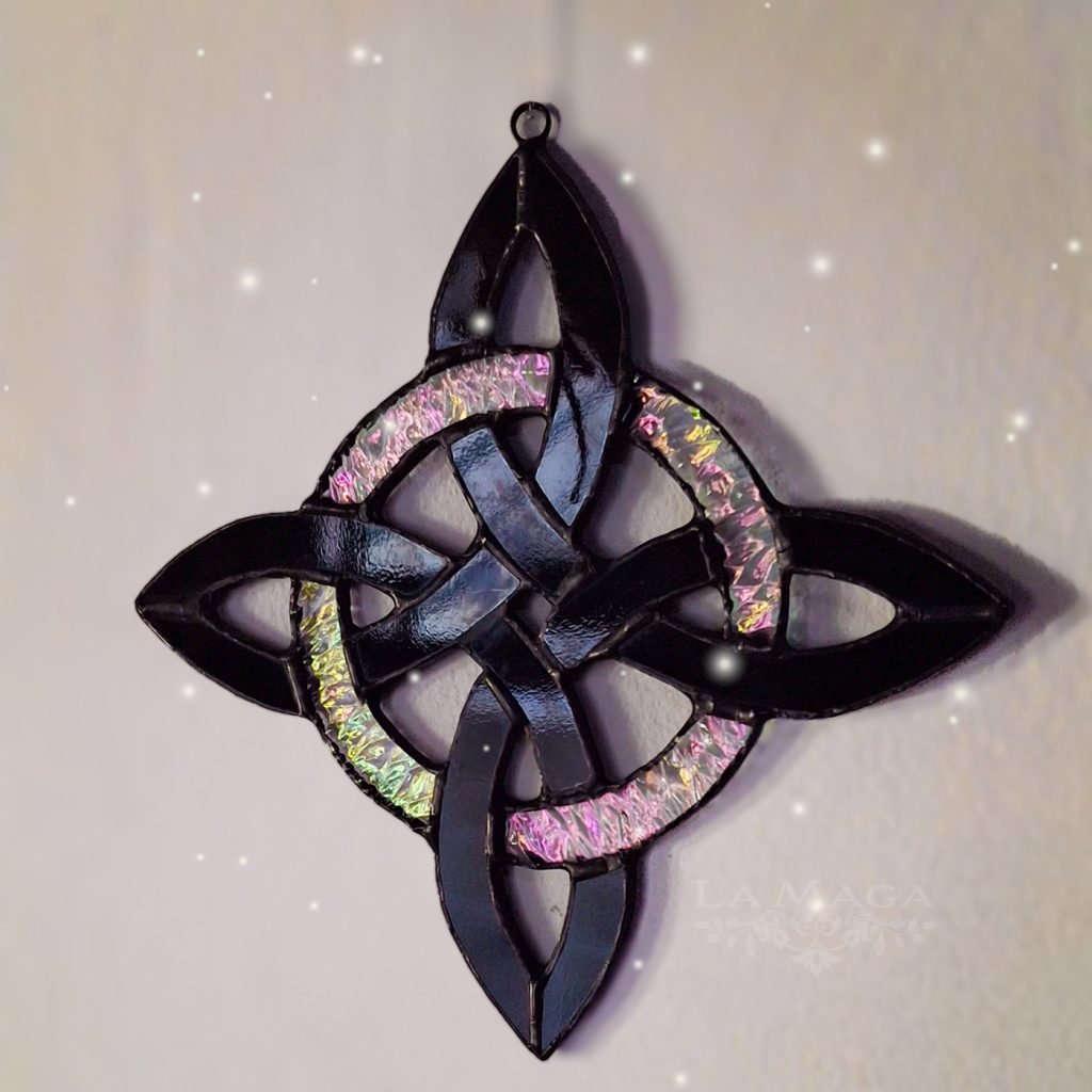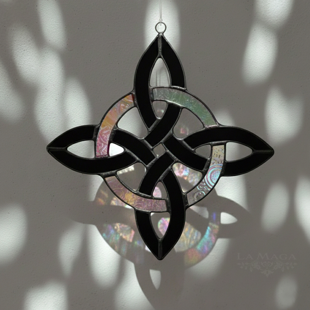 Respecto a los vidrios que utilicé para su confección, escogí el negro opalino para simbolizar la tierra y la capacidad de absorber y transmutar energías, mientras que el círculo elaborado en vidrio transparente iridiscente representa el velo entre los mundos y la claridad espiritual que nos guía. Una pieza de fuerza y misterio para tu hogar.