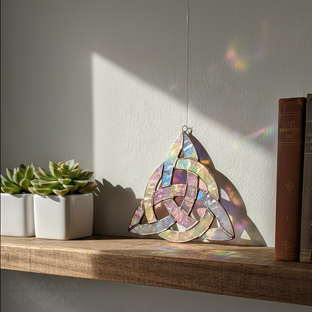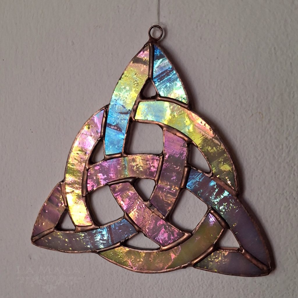Esta triqueta celebra la armonía y el amor propio. El rosa iridiscente evoca la compasión y la sanación emocional, mientras que el círculo crema iridiscente aporta una luz de pureza y calma. Es una pieza ideal para espacios de meditación o para quienes buscan fortalecer su paz interior.