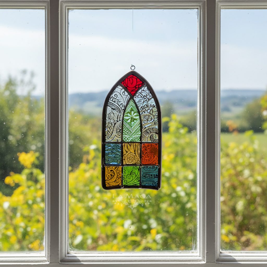 La otra con pequeños recortes de vidrios y diferentes arabescos en cada uno de ellos.